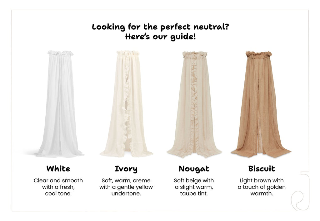 Les moustiquaires et les baldaquins sont spécialement conçus pour être utilisés avec un couffin ou un berceau. La différence entre les moustiquaires et les baldaquins de Jollein réside dans la longueur et la fixation supérieure des filets.