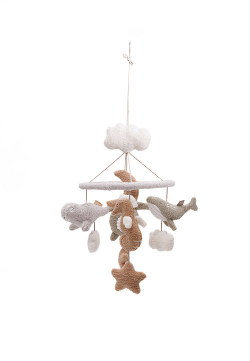 Faites découvrir à votre enfant le monde merveilleux de l'océan avec notre mobile Deep Sea. Ce mobile enchanteur est parfait pour être suspendu au-dessus du parc et permet à votre bébé de profiter d'une mer d'aventures. D'adorables créatures marines telles que des petites baleines, des petites tortues et des petits hippocampes sont suspendues au mobile, enrichi de coquillages, d'étoiles et de petites lunes amusantes. Les différents tissus, dont le tissu bouclette aux couleurs biscuit,vert olive et avoine beige, offrent une expérience sensorielle inouie. Introduisez les océans dans la chambre de votre bébé et laissez-le s'émerveiller devant le monde sous-marin grâce à ce magnifique mobile suspendu.
