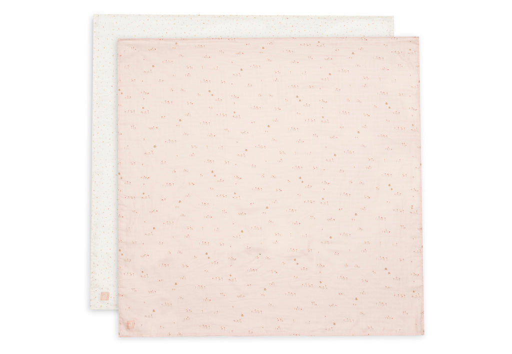 Bij Jollein kies je uit twee maten: 70 x 70 cm en 115 x 115 cm. De doek van 70 x 70 is de standaardmaat en perfect als spuugdoek, slab of bescherming voor je voedingskussen. De grotere doek van 115 x 115 cm gebruik je als inbakerdoek, handdoek of dekentje. Zo heb je altijd de juiste maat bij de hand.