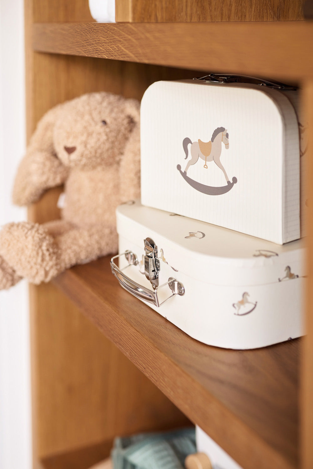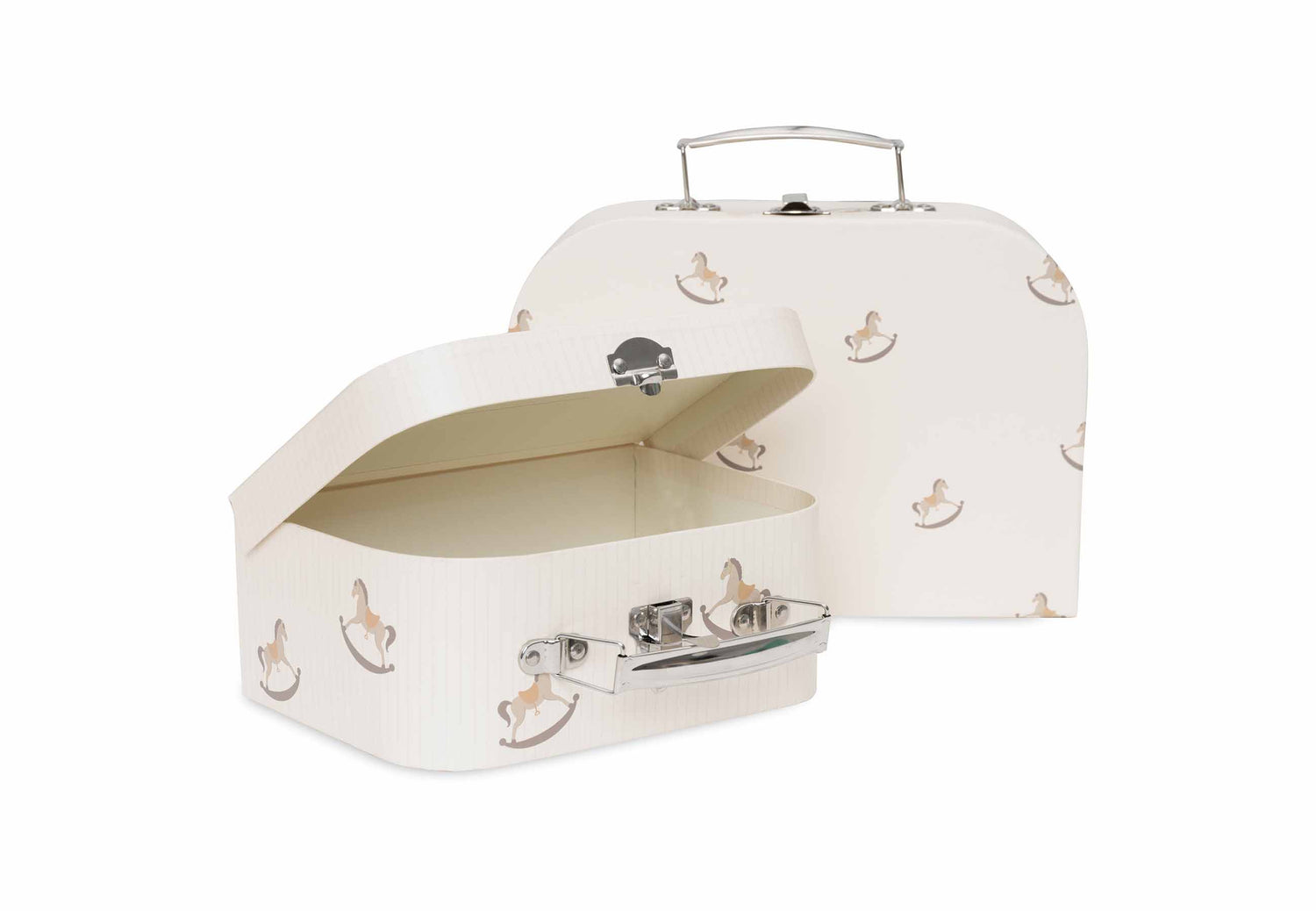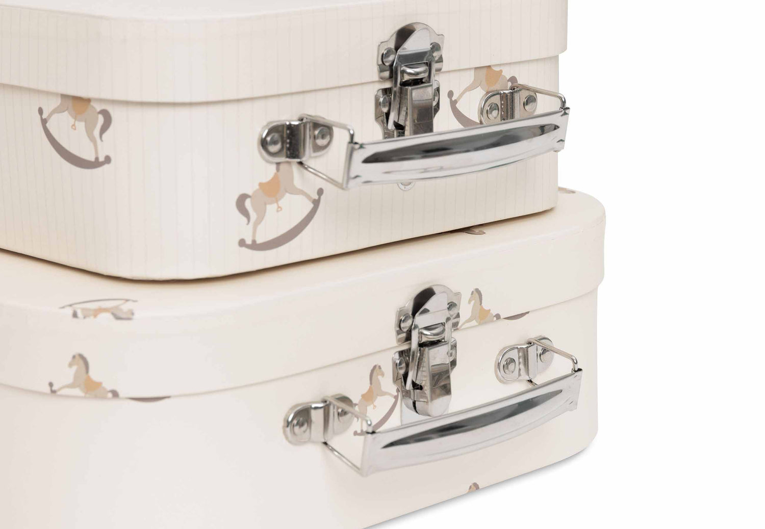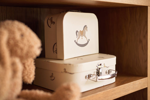Hoe cute zijn deze koffertjes samen! Ligt bij jullie de kinderkamer ook lekker vol met speelgoed? Met deze speelkoffertjes kan je deze items gemakkelijk opbergen. Deze 2 pack heeft 1 groter koffertje met een all-over print van het hobbelpaardje en 1 kleiner koffertje met een opdruk van het paardje uit onze nostaligic ride collectie! Welk kleintje moet deze koffertjes echt hebben?