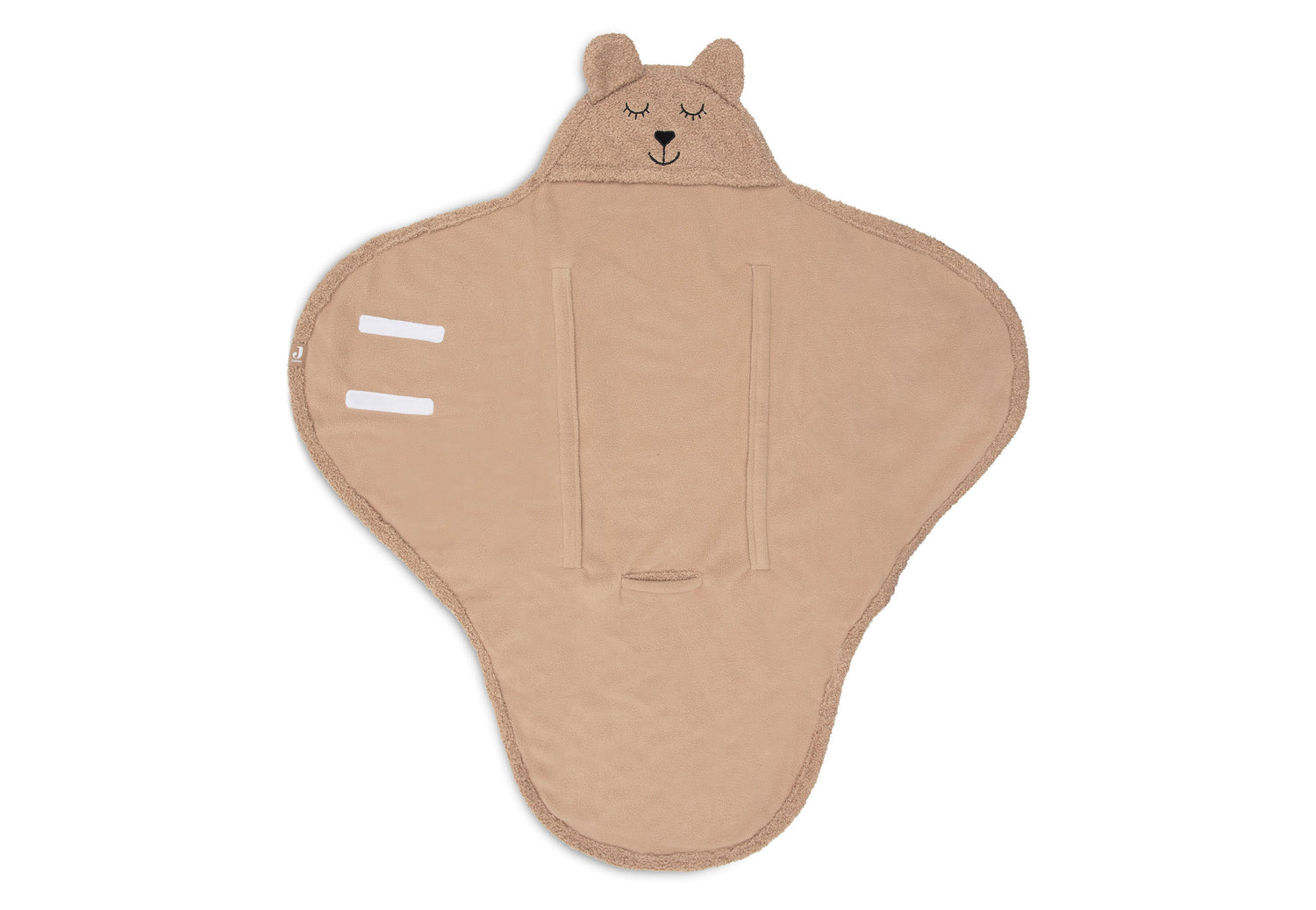 Wikkeldeken met gegarandeerd mega hoge cutenessfactor. De stof is van fluffly vachtlook aan de buitenkant en heerlijk comfortabel zacht aan de binnenkant. Wikkel je baby in deze omslagdoek en sluit de deken met de praktische klittenbandstroken. Zet het mutsje erbij op en zie daar, die schattige oortjes en dito berengezichtje op het mutsje. Echt te lief! Deze omslagdoek is te gebruiken vanaf de geboorte. En ook heel handig te gebruiken in baby’s eerste autostoel. De gordels van de autostoel kun je door de openingen in de deken halen waardoor je baby lekker in de omslagdoek kan blijven zitten. Het is een universele wikkeldeken voor de Maxi Cosi en elk ander merk categorie 0 autostoeltje met drie of vijfpuntsgordel. Verkrijgbaar in diverse kleuren.