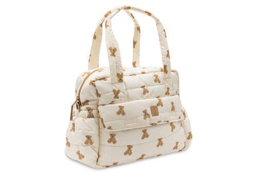 This trendy diaper bag from the Mini Teddy Bear theme combines a cute look with plenty of functionality. The bag is spacious, providing enough room for all the essentials you need on the go. The front features convenient pockets with Velcro closures, including a matching changing pad that’s always within reach. Thanks to the bionic finish, the bag is water-repellent, making it perfect for any weather. You can carry it easily by hand or with the adjustable shoulder strap. Tip: pair the bag with our stroller hooks for even more convenience while walking.