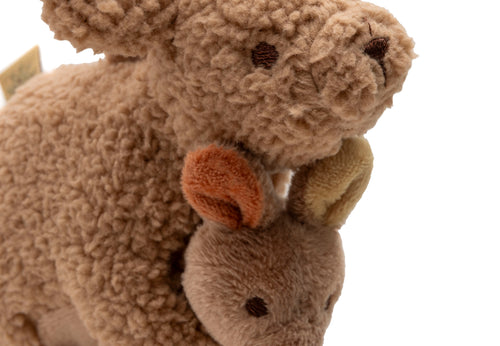 How adorable is this Kangaroots-themed pram hanger! The soft kangaroo carries her baby safely in the pouch, securely fastened. Together, they form a cozy duo that provides warmth and comfort on the go. Made from super-soft coral fleece and finished with delicate details, the hanger is not only cute but also delightful to touch. Thanks to the handy ring, you can easily attach the pram hanger, so your little one always has this sweet kangaroo close by.