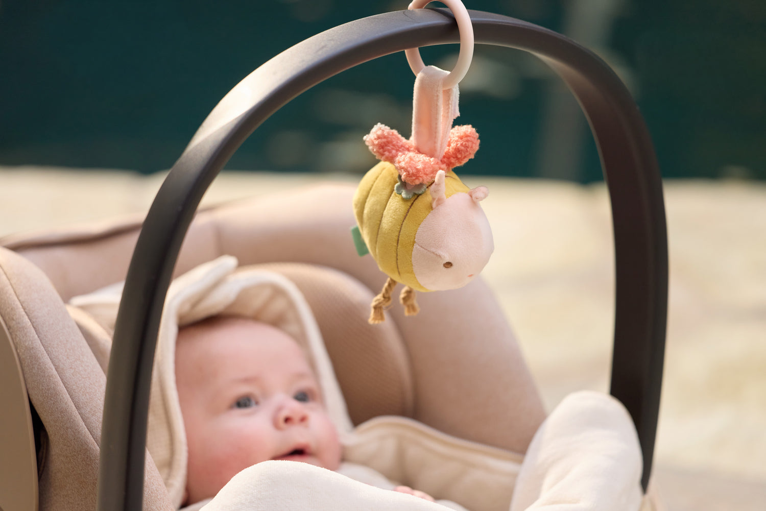 How cute is this pram chain from the Pretty Picnic theme! The adorable bee features playful details and an embroidered face. Inside is crinkly paper and a small bell, making it even more fun to explore. Attach it easily to the pram with the ring, giving your little one something fun to discover on the go.